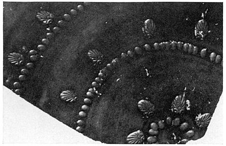 Description:   Piece of floor with low base ring. Rim missing but moulding at inner edge and upturn on outside preserved. Moulded ring near center of underside. On the floor, three circles of small plain eggs, outside of each circle a ring of small palmettes, neat and rather deep set.