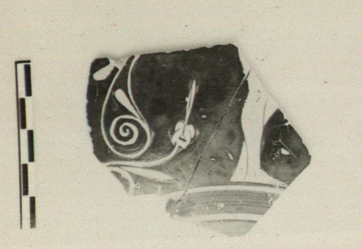 | Description: | Nothing of rim or stem preserved. Outside decoration: nude figure facing right, standing above two reserved lines, only the legs preserved. Behind, part of a floral scroll pattern. Inside decoration: bit of medallion border preserved; medaillon broken by cross squares. Thin red to black glaze on inside and below band on outside. ADDENDA About 420 B.C. [JDB, Summer 1953]. | |