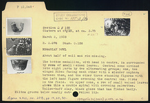 | Description: | About half of wall and rim missing. Restored in plaster. Miltos groove below neatly out-rolled lip. Relief decoration: the bottom medallion, with head in center, is surrounded by rows of small veined leaves. Central zone divided into eight parts by two alternating groups; one, two winged Nikes facing each other with a slender amphora between them, and the other, three standing figures with the left hand figure crowning the central one. Birds in the field. On upper zone, a row of small veined leaves, above this a double spiral with crowning palmettes. Yellow-buff clay. Black glaze that has flaked badly. | |