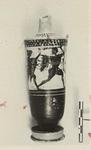 | Description: | Handle, lip and upper part of neck missing. Cylindrical body with upper part slightly concave. Disk foot with moulding at bottom. On white ground, Herakles stealing the tripod from Apollo. A three-branched tree to right and left of the figures. Above, at top of wall, three rows of dots. Below, two grooves scratched through the black glaze. On shoulder, rays; on front half, a line of shorter rays inside main band. Cf. Haspels (1936), pl. 48, 4: Tyrannicides by Emporion painter. | |