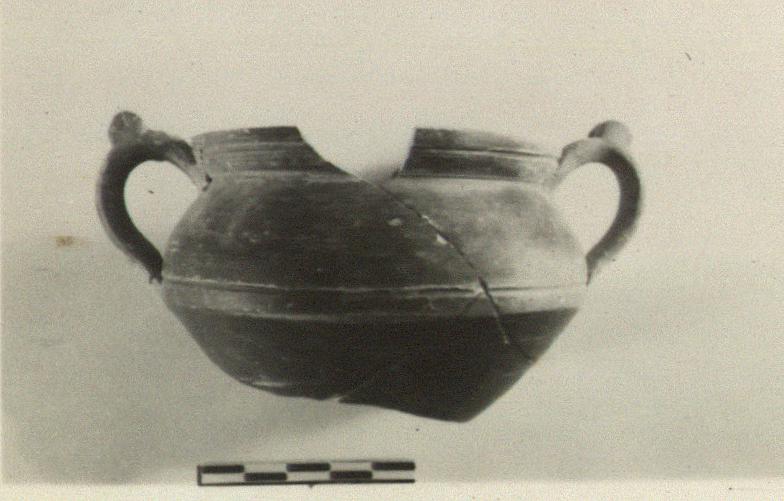 | Description: | Bottom and about one-third of rim and sides missing. Restored in plaster. Double convex sides, slightly flaring rim with groove around outside. Two vertical strap handles with knob on top. Groove around point of widest diameter. Buff clay, fired irregularly light red-brown to black. Glazed inside. | |