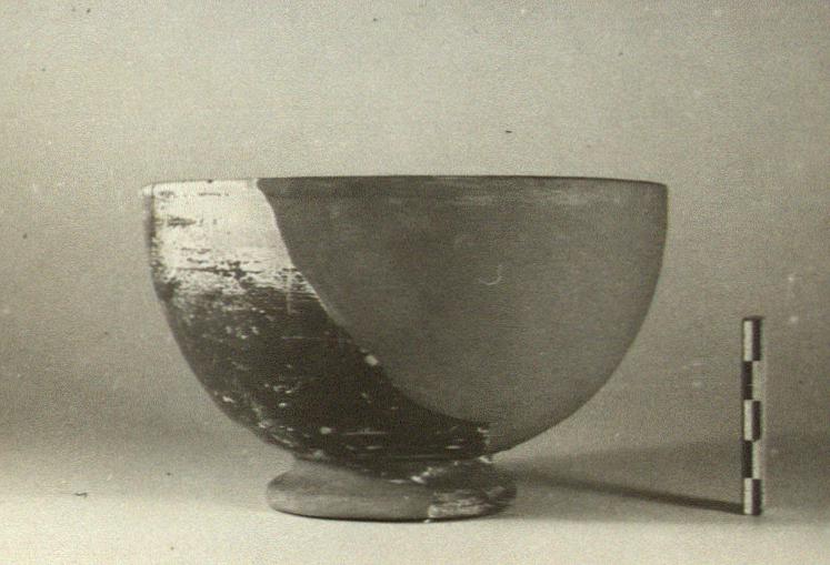 | Description: | Full profile of Pergamene bowl preserved; about five-sixths of rim and two-thirds of foot missing. Restored in plaster. Hemispherical bowl on high moulded base ring; plain lip. Yellow clay. Dark red glaze, partly peeled. | |