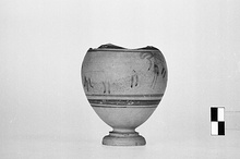 | Description: | Hadra-ware jug, missing all of neck and shoulder, with part of one side. Egg-shaped body on a small moulded base. Decorated in thinned glaze with pendent garlands; bands above and below. Light buff clay with polished surface. | |