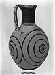Description:   The front of the trefoil mouth missing; restored in plaster. Low flat base, a cross on the bottom, Rounded body, and tall, slightly concave neck. On the body, four sets of concentric circles, overlapping and filled at the center with eight-armed crosses; hour-glasses on the shoulder. The neck glazed, with two bands at its junction with the shoulder. A wavy band between two verticals on the shoulder.
