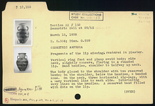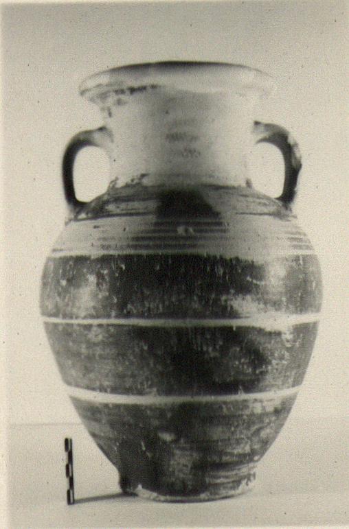 | Description: | Fragments of the lip missing; restored in plaster. Vertical ring foot and plump ovoid body; wide neck, slightly concave, flaring to a rounded lip. Band handles, shoulder to halfway up neck. The body glazed to the shoulder with two reserved bands; on the shoulder, below the handles, a banded zone. On the neck, three horizontal zigzags, with a wavy vertical line to each side. Interlacing wavy lines on the handles. A reserved band filled with dots on the lip. Attic clay, with traces of slip; black to reddish brown glaze, somewhat peeled. | |