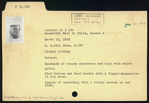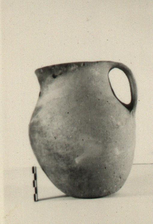 | Description: | Intact. Flat bottom and band handle with a finger depression at its base. Traces of smoothing with a stick; burned on one side. Handmade of coarse micaceous red clay with white grits. | |
