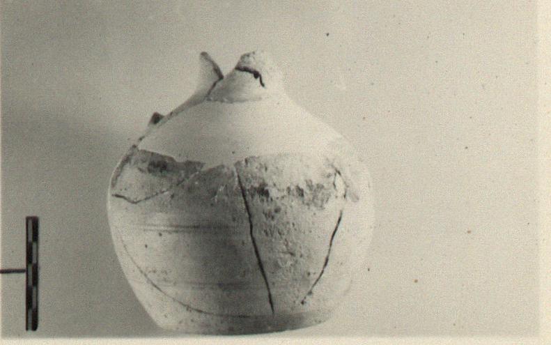 | Description: | The neck and mouth and band handle, missing; shoulder filled out in plaster. Flat bottom and squat rounded body. Decoration of pairs of narrow, widely spaced horizontal glaze bands. Pink clay covered with thick white slip, much peeled. | |