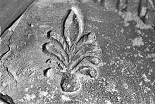 | Description: | About half missing, including both handles. Restored in plaster. Low base ring, sloping floor; high vertical rim, tilted in; horizontal handles turned back on themselves. Palmettes stamped on floor, inside a circle of heavy rouletting. Thin red-brown to gray clay. Matte black glaze on inside; splashes of thinned glaze on outside. | |