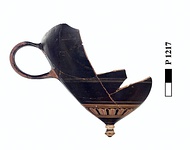 | Description: | The lower part and the whole handle preserved, also a very small segment of the rim (not above the handle). Accessory red for alternate tongues of pattern around top, for two narrow bands below this and a pair above, for a pair just below the handle, and for the sides of the handle. The handle is concave outside. The rim tapers to a narrow reserved top. Fine fabric; fine lustrous glaze. | |
