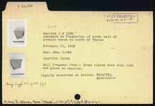 | Description: | Wall fragment from a large closed vase with thin red glaze on outside. Lightly scratched on inside: <graphic> ADDENDA: Originally catalogued as graffito. | |