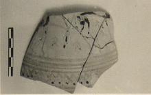 | Description: | From the body and shoulder of a closed pot: amphora or oinochoe. Below the shoulder, bands and a dotted lozenge chain. On the shoulder, a band of grazing deer right, birds in the field. Dull black glaze, much peeled. | |