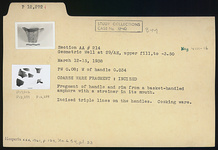 Description:   Fragment of handle and rim from a basket-handled amphora with a strainer in the mouth. Incised triple lines on the handles.