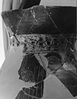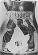 Description:   Fragmentary; restored in plaster. Missing, the lower part of the handle and its attachment, about half the rim and much of the walls. The figured panel is not set square with the handle, but begins close to it on the left side of the vase. Across the top of the panel, a band of double alternating lotuses and palmettes; below it and framing the sides and bottom of the panel, a single thin glaze line. Reserved, besides the panel, two roughly triangular spaces on the right side of the body, a band round the lower part, the underside of the foot, the double handle, and the inside of the pot below the neck. On the handle, a thin glaze line along the top of each half, and another along the side. The central figure is a woman in long chiton and himation. She faces right, with her left hand holding back from her face the cloak drawn up over her head. She is complete save for damage to her dress front and back. On either side of her stands a warrior. The one on the right faces her; his head with crested helmet, most of his shield, part of his spear, a fragment of his greaved legs and a bit of his left heel preserved. Close behind him, her left hand on the shield rim, is another woman, also facing toward the center. She wears long chiton and folded himation; her face is chipped away and a bit of the front of her dress is missing. Of the second warrior, standing to the left behind the central figure, only a bent elbow and the legs, with feet turned right toward the center, remain. Behind him, the leftmost figure of the group, a third woman, also faces toward the center, and lays her right hand on the warrior's arm. She wears long chiton and himation; the back of her shoulders, and a bit from the top of her hem missing.