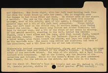 Elaborately incised ornament (imbricated, zigzag and running dog patterns) on the breasts, hems and borders of the women's dresses. A zigzag on the crest of the warrior's helmet. The edge of his shield, and a band inside, incised with compasses. Red on the cloaks, and the centers of the palmettes and lotuses. White for the woman's flesh (in part preserved when found), for the emblem on the shield, and the dots on its band.