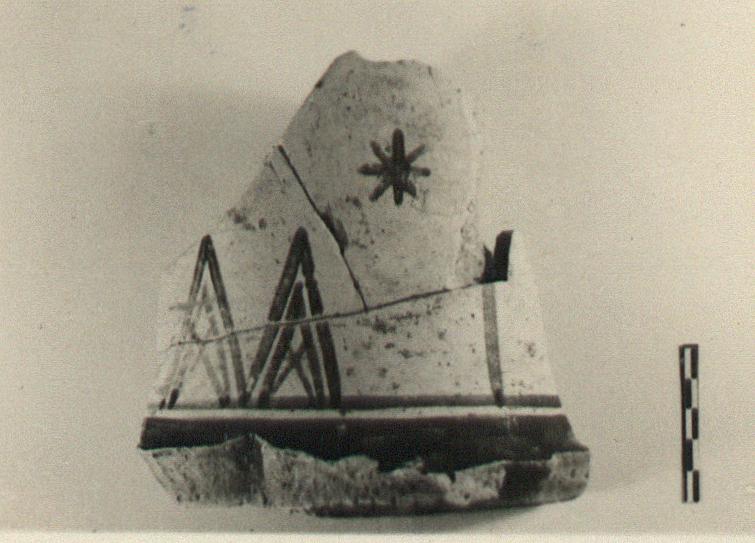 | Description: | From the neck of a large amphora of heavy fabric. The shoulder glazed. Handle panel set off by a vertical. At the front, concentric triangles, filled by St. Andrew's crosses; stars above. Black to dull brown glaze. | |