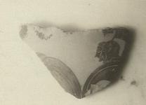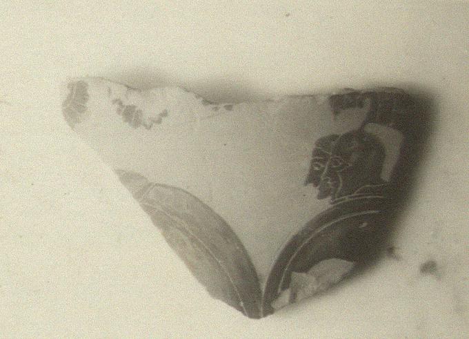 | Description: | Fragment from upper part of body of vase; above, left, start of neck curve and ornament. Decoration in panel: Warrior and attendant; the object ahead of the pair is perhaps a shield seen in perspective. Glaze uneven. | |