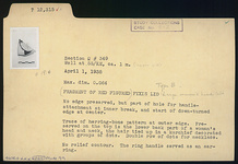 Description:   No edge preserved, but part of hole for handle attachment at inner break and start of downturned edge at center. Trace of herringbone pattern at outer edge. Preserved on the top is the lower back part of a woman's head and neck left, the hair tied up in a kerchief decorated with groups of dots; double row of dots for necklace; no relief contour; the ring handle served as an earring.