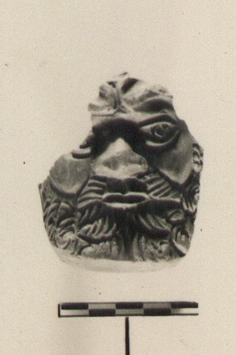 | Description: | Lower part only preserved with most of the face of a grotesque bearded figure. Bottom plain, flat. Fine hard brown clay, gray at core; brownish glaze. Cf. P 8036. | |