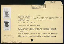 | Description: | A cylindrical piece flaring at neck, with flat pierced top. Traces of handle attachment at base of both sides. Gouged diagonal lines on end, stamped ovules below. Light brown clay. Thin red-brown to black glaze. ADDENDA Same vessel as P 23213? [JWH]. | |