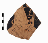 | Description: | Fragment from middle of wall; thin brown glaze on inside. Depicted are the lower part of a charioteer and the upper part of his chariot, moving right. On the front of the chariot, a round ornament with a combat(?) scene in black figure. Below it, four spirals and a leaf. The charioteer wears a long loose chiton. Relief contour for parts of the chariot and for the reins. Two horizontal lines in an added color may be traces. ADDENDA (Sept. 2020), according to Agora XXX, Amphora fragment. | |