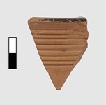 | Description: | Fragment from upper wall and rim. Around the top of the wall a collar with seven grooves. Traces of the attachment of a cross-arm. Black glazed on inside and on top of rim. | |