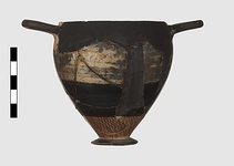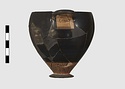 | Description: | One handle and fragments from wall and base are missing. Corinthian type; cross-hatching on lower wall; much contracted toward the base; lip incurved. Underside of foot reserved with two glazed circles; handle spaces reserved. Glaze mottled in part to red and whitish. Cf. Agora XII, no. 325. | |