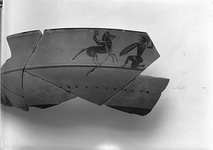 | Description: | About one-third of the rim and handle zone and one handle are preserved. Glaze wearing off handle. Combat scene of hoplite and horseman on lip zone. The spear which the hoplite is apparently hurling has not been painted in or has disappeared. Senseless inscription in the handle zone. The horizontal band below the scene is slightly out of line. Reserved band on the inside of the rim. Good black glaze on interior. | |