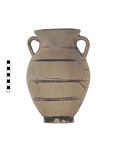 | Description: | Much of mouth and some of body missing. Restored in plaster. Shape and decoration as P 12444 (Φ 642), but the band handles shorter, from below lip to shoulder. Black glaze bands fairly well preserved, on one side, worn on the other; crossed bands on handles. | |