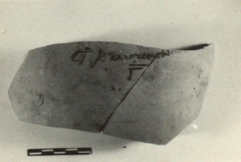 | Description: | From the shoulder of a large closed pot, possibly an amphora; thin coating of resin or pitch on inside. Dipinto in black, incomplete at right: <graphic> Yellow-brown clay. ADDENDA Mended up to make a pot: P.H. 0.28, Diam. 0.25. Neck, most of shoulder, parts of wall and a little of foot missing; no trace of handles. Plump ovoid pot, probably an amphora. False ring foot with elaborately moulded depression beneath. | |