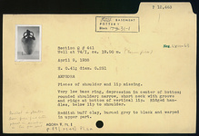 | Description: | Pieces of shoulder and lip missing. Restored in plaster. Very low base ring, depression in center of bottom; rounded shoulder; narrow, short neck with groove and ridge at bottom of vertical lip; ridged handles, below lip to shoulder. Reddish-buff clay, burned gray to black and warped in upper part. | |