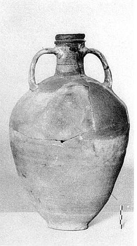 | Description: | Pieces of shoulder and lip missing. Restored in plaster. Very low base ring, depression in center of bottom; rounded shoulder; narrow, short neck with groove and ridge at bottom of vertical lip; ridged handles, below lip to shoulder. Reddish-buff clay, burned gray to black and warped in upper part. | |
