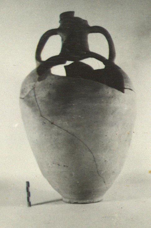 Description:   Pieces of shoulder and lip missing. Restored in plaster. Very low base ring, depression in center of bottom; rounded shoulder; narrow, short neck with groove and ridge at bottom of vertical lip; ridged handles, below lip to shoulder.