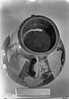 Much warped and damaged in making: the neck not round; higher on one side than on the other. In one side a large dent. Thin, rather dull black glaze; well preserved on one side, on the other, much peeled.