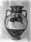 Decoration in panels. Horse and rider right on each side. Scanty incision for interior details; red for the horses' manes, and a line around the inner edge of the lip. Smooth polished finish on the panel, resembling a dilute glaze wash. The foot unglazed beneath, the pointed end of the body of the pot appearing within the base ring. The neck glazed for 0.05m. inside.