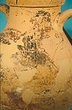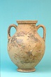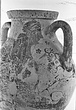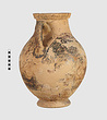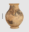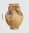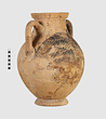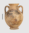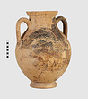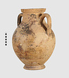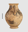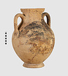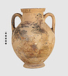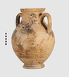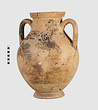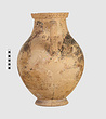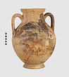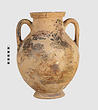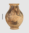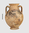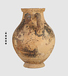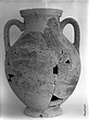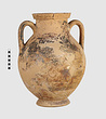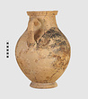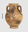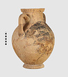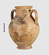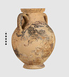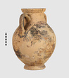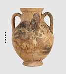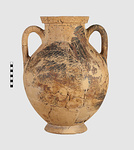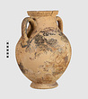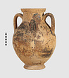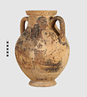 | Description: | One piece amphora. Mended from many pieces. Complete save for scattered small gaps in the body and chips from the base. The surface is severely weathered especially on one side. On either side, a sphinx fills nearly the whole field. She is crouched on a broad band of glaze below which rays spring from the foot. The top of her head just misses a narrower band of glaze below the rim. Her forepaws reach forward to under one handle and her wing grazes the other. A space is left above and in front of her hind paws where the body does not touch ground; here the tail curls up from between the feet with dot rosettes on either side. Next to the lower handle attachment in the space between her head and forepaws is a decorative figure composed of tendrils and palmettes; probably traces of another behind her head. Behind the upper part of the wing more dot rosettes and a dotted zigzag. Red is freely used and the interior drawing is done in careful incision (used for all borders between red and black but not for exterior contours). The face, neck and ear are red, with black eyebrow and pupil. The hair is caught in behind the ear by an incised band with zigzag pattern. It is crowned with a red fillet; below, it falls in tresses across the broad red upper part of the wing which is continuous over the breast. The legs and the lower part of the wing (with incised feathers) are black; the belly red. Red is also used for parts of the decorative figure and incision for its interior drawing. On the rim were red incised rosettes and on the glazed handles are traces of red. The spreading ring foot was glazed on the outside save a reserved band at the lower edge. The rim is not flat-topped but curves in from its edge and is glazed inside for about its exterior height. Attic orientalizing. | |