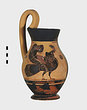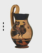 | Description: | The mouth and the handle missing, with fragments of the body. Flaring echinus foot. In a square panel on the body, bordered with purple, a siren, right; a rosette in field in front. Good incision; added purple for chest, face, wing and feathers. Two small reserved triangles on opposite side of body. Glaze black to red. | |