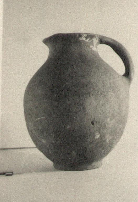 | Description: | Small hole in wall. Ring foot, plump body, rolled handle and slightly trefoil mouth. Coarse micaceous brownish clay with large grits; unglazed. | |