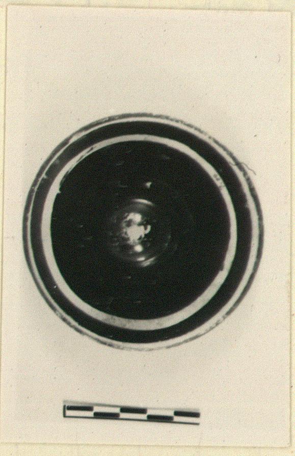 | Description: | Intact except for chips. Flat lid with heavy plain central knob; shallow turned down rim. Black glazed except for two reserved bands at outer edge of top and edge of rim. Glaze somewhat worn. | |