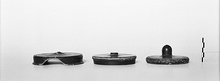 | Description: | Intact except for chips. Flat lid with heavy plain central knob; shallow turned down rim. Black glazed except for two reserved bands at outer edge of top and edge of rim. Glaze somewhat worn. | |