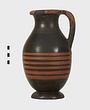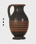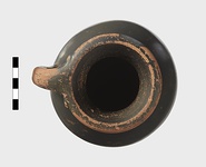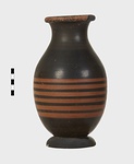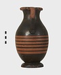 | Description: | Intact except for about one-half of foot and chips. High echinus foot, slender body, thickened projecting lip; handle round in section, lip to shoulder; two small projections on the lip, at its upper attachment. Black glazed outside, save for six broad reserved bands around body. Underside reserved, inside glazed to bottom of neck; glaze considerably worn on lip and handle. ADDENDA n.b. In many of the archaic graves from the Kerameikos there are ordinary lekythoi with just such reserved bands. Seen Sept. 1958/LT | |