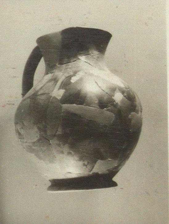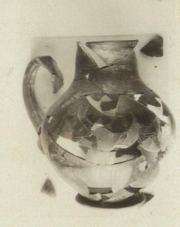 | Description: | Mended from many pieces. Considerable scattered portions missing; restored in plaster. Combat scene of armed men between spectators. The combatants wear helmets, tunics and greaves and carry shields (one seen in perspective?). The weapons in their raised hands are lost in the breaks. On either side, a youth in a mantle. The panel is bordered above by a very sloppy ivy pattern; on either side and below is a line of glaze. Hasty incision for interior details. Accessory white in blobs on the full-face shield, red on the other shield and on the lower parts of the tunics and a few other places. Careless execution. Broad ring foot, reserved underneath. Trefoil lip with large pouring section; glazed inside. Glaze very unevenly fired: mottled and red and cloudy. | |