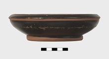 | Description: | Complete. Wide shallow bowl on substantial ring foot. The wall set off from the down-sloping lip by a reserved groove; also reserved: the foot, the inner edge of the lip and the center of the floor with single circle and dot. | |