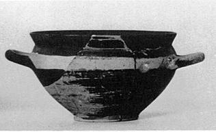 | Description: | Rather more than half the wall preserved, with part of the base, a small piece of the lip, and one handle. Flat raised base, rounded wall with high shoulder, flaring lip. Streaky worn black to brown glaze over all, except for a reserved line inside the lip, the handle zone, the inside of the handle, and the bottom. | |