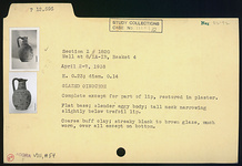 | Description: | Complete except for part of lip, restored in plaster. Flat base; slender eggy body; tall neck narrowing slightly below trefoil lip. Coarse buff clay; streaky black to brown glaze, much worn, over all except on bottom. | |