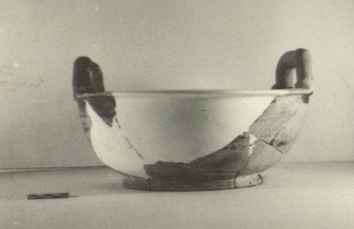 | Description: | Two non-joining fragments preserve both handles, most of the base and part of the rim and walls. Restored in plaster. Ring foot; open body; narrow projecting rim flat on top. Two heavy horizontal handles, round in section, rising from rim. Worn black glaze over all, except underneath. | |