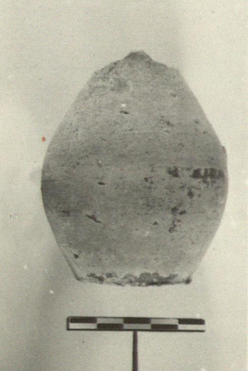 | Description: | Neck, rim and handle missing. Restored in plaster. Small plump jug, its point of greatest diameter near the middle. Flat bottom. Black glaze, almost entirely peeled, not reaching quite to bottom; reserved band around middle. | |