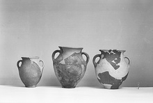 | Description: | Parts of wall, lip and base restored in plaster. Large amphora on small ring foot; broad ovoid body; wide neck; plain slightly flaring lip flat on top. Handles, round in section, neck to shoulder. Handmade, of coarse red micaceous clay; lighter slip. One side much blackened from use. | |