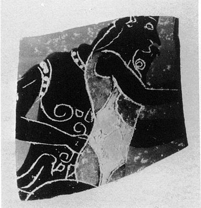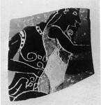 | Description: | From the wall of a closed pot (amphora?). Head and neck of bearded man facing left; purple used for beard and collar. Part of leaf above the head. | |