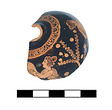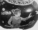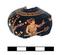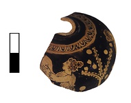 | Description: | Shoulder piece of squat lekythos. A narrow band of black egg and dart at top of shoulder. Below, scene with playing women: parts of three figures and tree preserved. At left of tree, a woman facing left with large object in outstretched hands; figure preserved from waist up. To right of tree, woman facing right with left arm raised and thyrsos held out at waist level in right hand; preserved from slightly below waist. Further right, outstretched hand of third figure. Both of preserved figures wear thin chitons, bracelets and fillets. Added white(?) for the fillets, the hair brown. Relief contour for profiles and napes. | |