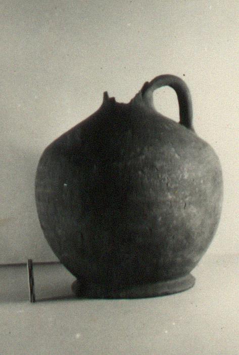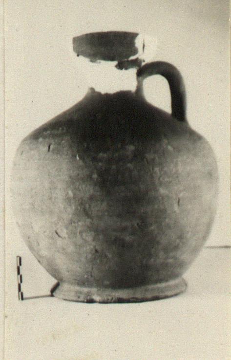 | Description: | Lip missing except for small piece at back; otherwise intact save for chips. [Fragment of round bell mouth found in sherds; restored in plaster.] Very bulbous body with continuous curve from short narrow neck to base; low flaring base ring; short strap handle, with concave outer surface. Red-brown clay with white bits in it. Brown slip, somewhat cracked and peeled. Unglazed. | |